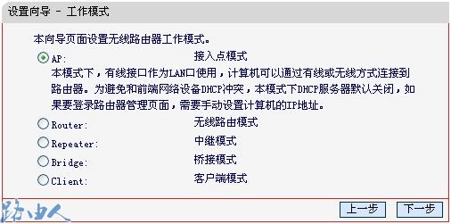 二、连接上水星路由器后,在浏览器中输入192.168.1.253,输入登陆用户名及密码均为admin,打开MW150RM的管理界面,自动弹出设置向导点击下一步开始设置,弹出工作模式设置页面。