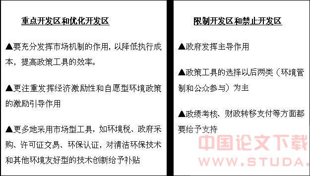 鉴于不同区域的环境承载能力、环境特征、生态功能存在着显著差异,为保证政策的有效性,应实行区域差别化的环境政策,以更有利于资源空间配置的优化,使人口、经济活动等的分布能够与各个区域的资源、环境、生态的承载能力相匹配,实现人与自然的和谐发展,实现区域协调发展。?
