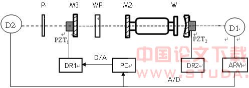 半外腔单纵模 He-Ne 激光器,通过控制压电陶瓷 PZT2 可以使激光器始终在中心频率附近工 作;M3 为回馈镜,反射率为 10%,由压电陶瓷 PZT1 驱动,在计算器输出的三角波信号的 驱动下做往复运动;WP 为待测波片,其快轴方向与激光器的本征偏振方向一致;D1 为光电探测器,探测激光器的光强信号,经放大器 APM 及 A/D 转换后送入计算机处理;P 为检 偏器,与光电探测器 D2 一起探测回馈信号的偏振信息。
